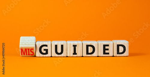 Guided or misguided symbol. Turned wooden cubes and changed the concept word Misguided to Guided. Beautiful orange table orange background, copy space. Business and guided or misguided concept.