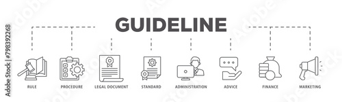 Guideline icons process flow web banner illustration of rule, procedure, legal document, standard, administration, advice, finance, marketing icon live stroke and easy to edit