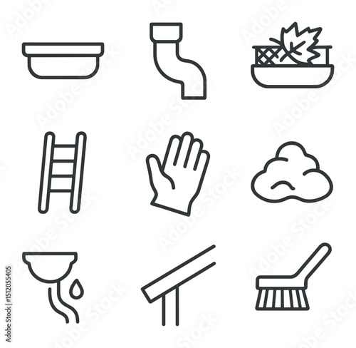 Gutter Maintenance Icons. Outline icon set of gutter maintenance: gutter channel, downspout, leaf guard, ladder, gloved hand,