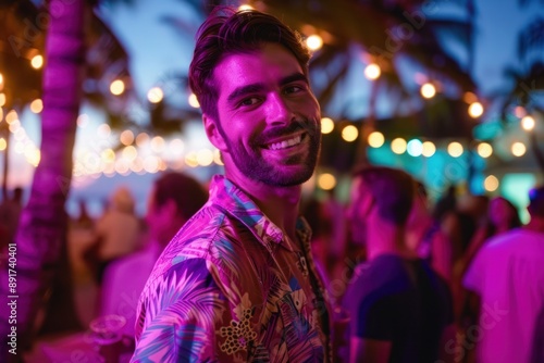 Guy at an outdoor party on vacation on an exotic beach, in neon lights, with palm trees in the background