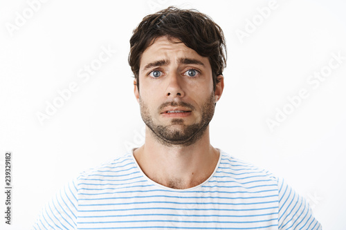 Guy feeling uneasy looking reckless and desperate at life falling appart standing intense and sad lifting eyebrows in sadness being worried as making things worse standing unhappy over gray wall
