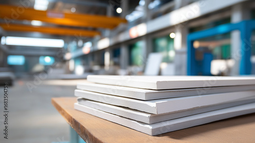 Gypsum Drywall Sheets Stacked in Modern Warehouse Ready for New Home Project with Clean Edges and Labels Highlighting Industrial Material Preparation and Storage Organization