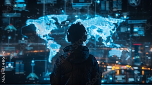 Hacker Accessing Satellite Network with Global Map and Communication Lines Concept