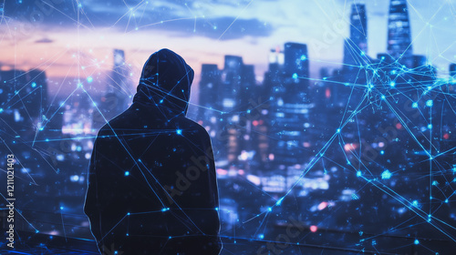 Hacker are planning to hack and attack networks and cyber security systems.Smart digital Innovation city with connection network reciprocity over the cityscape