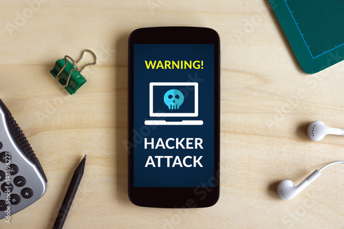 Hacker attack concept on smart phone screen on wooden desk. All screen content is designed by me. Flat lay