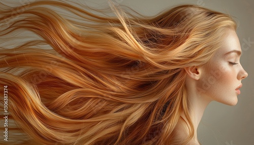 Haircare and scalp care concept. Golden hair flowing gracefully with a serene expression on a model's face.