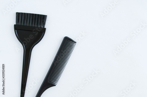 Hairdressing tools. Plastic black comb and brush for coloring hair on white background.