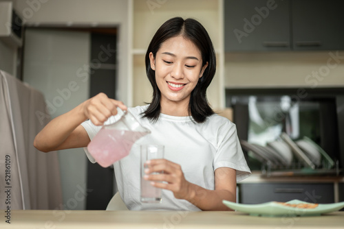 Half Asian woman drinking juice and eating crackers (Healthy whole grain) for breakfast before going to work, Small room in condominium background, Wake-up activities