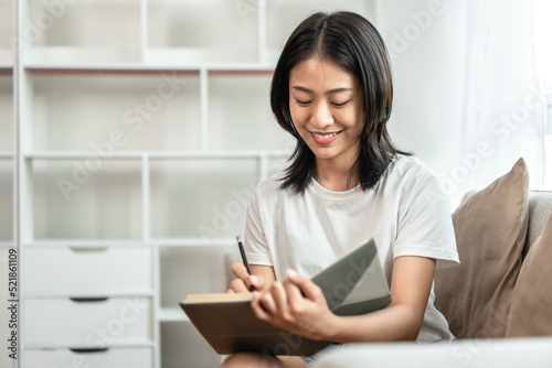 Half-Japanese woman is writing a diary on the sofa in her living room, Daily routine record, Relaxing time on vacation, Happy time, Living at home, Comfortable corner