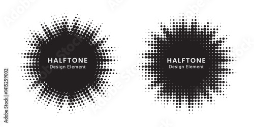 Halftone circle frame background set. Round border Icon using halftone random circle. Grunge circular stain. Vector illustration.