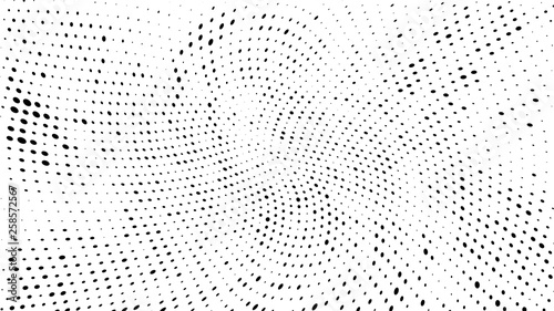Halftone gradient pattern. Abstract halftone dots background. Monochrome dots pattern. Vector halftone texture. Radial twisted circle. Grunge texture. Pop Art, Comic small dots. Wave twisted dots.