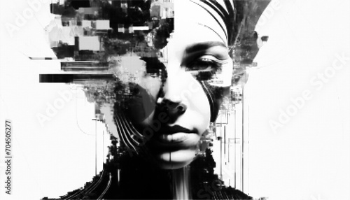 Halftone vector montage of a synthetic female face combined with abstract fractals and other graphic elements.