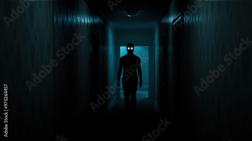 Halloween background with figure in dark corridor glowing eyes