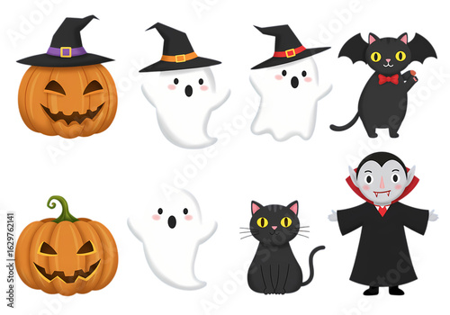 Halloween Character Set: Pumpkins, Ghosts, Cats, and Vampire
