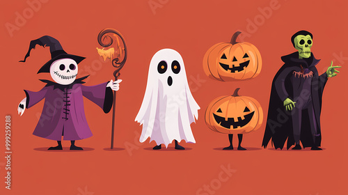Halloween characters horror vector set design. Halloween character like grim reaper, ghost, pumpkin and Frankenstein.