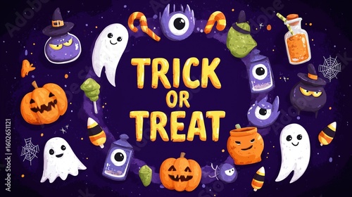 Halloween Circle Frame Vector: Cute Ghost Couple, Cauldron, Pumpkins, Bats, Candy with 'Trick or Treat' Text on Purple Flat Background, T-Shirt Print Design