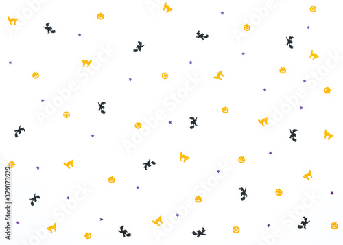Halloween concept. Halloween decorations on white background. Greeting or invitation card. Flat lay style, top view, pattern.
