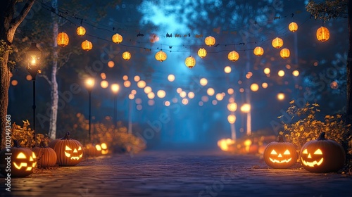 Halloween festival night scene with glowing lanterns, pumpkins, and a foggy background. Copy space on the side for your text