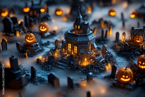 Halloween graveyard with crumbling tombstones, surrounded by fog and glowing jack-o’-lanterns, with the faint sound of whispers on the wind