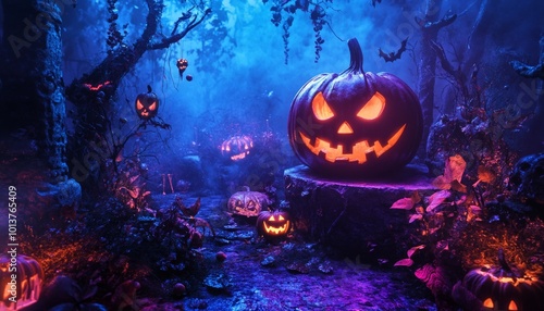 Halloween Party with Dark Illuminated Jack-O'-Lanterns and Glowing Lights in a Spooky Forest