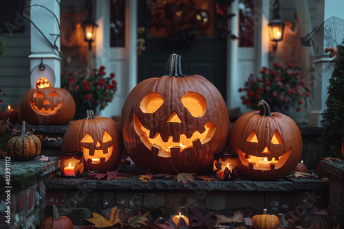 Halloween preparations. Carving jack-o-lanterns on a porch