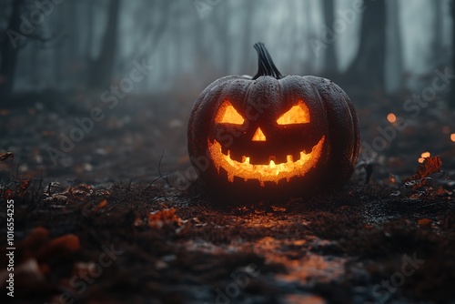 Halloween pumpkin with glowing face in foggy forest. Halloween concept background