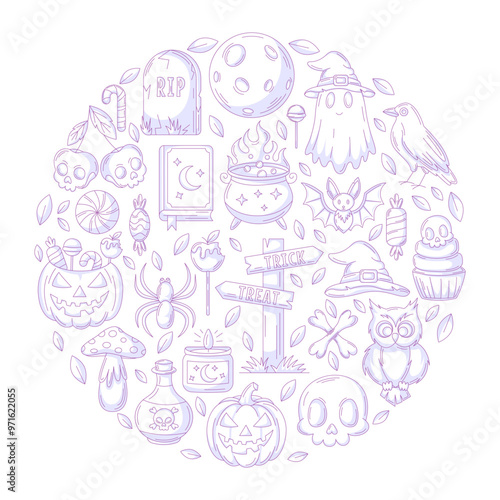 Halloween vector design, round shape geometric composition with spooky, scary icons collection. Holiday october flat purple illustration for greeting card, invitation, print, social media, poster