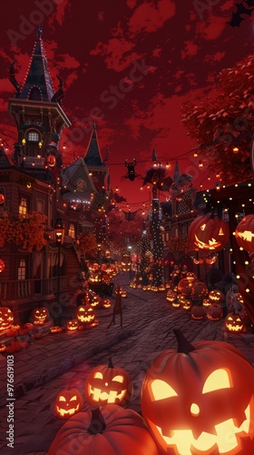 Halloween-themed city square with spooky decorations and glowing jack-o-lanterns, set against a dark crimson sky. Full ultra HD, high resolution --ar 9:16 --no noise --v 6.0 - Image #2 @hamza