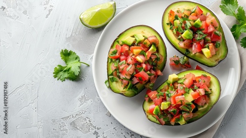 Halved avocados filled with diced tomatoes, cilantro, and lime on white plate