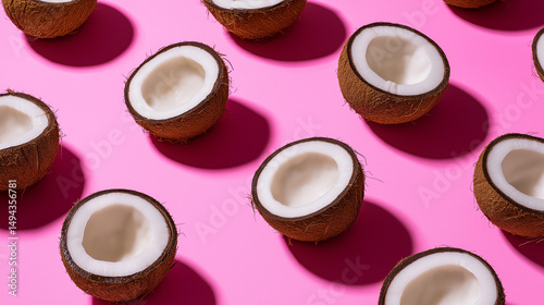 Halved Coconuts Arranged In Seamless Pattern On Vibrant Pink Background With Dramatic Shadows
