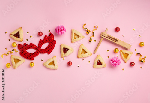 Hamantaschen Cookies, Red Carnival Mask, Noisemaker on Pink Background. Purim Celebration, Jewish Carnival Holiday Concept.