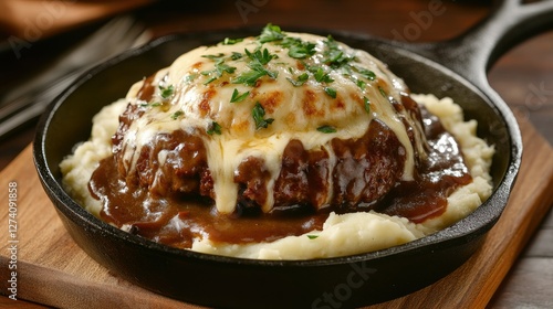 Hamburg steak with melted cheese on top, served in a cast iron skillet with thick onion gravy and creamy mashed potatoes