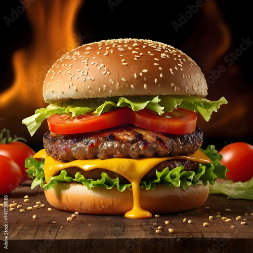 Hamburger gourmet beef steak meal meat. Burger with french fries and fire.Burger with vegetables and sauce on wooden background.