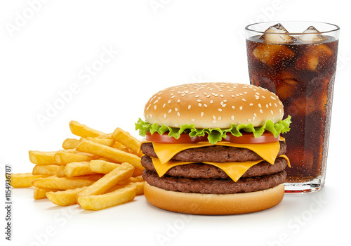 Hamburger meal served with french fries and soda close-up isolated on white background