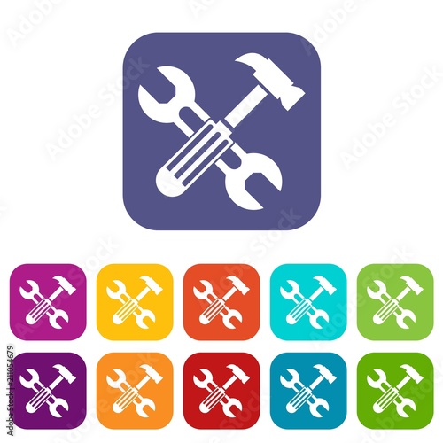 Hammer and screw wrench icons set vector illustration in flat style in colors red, blue, green, and other