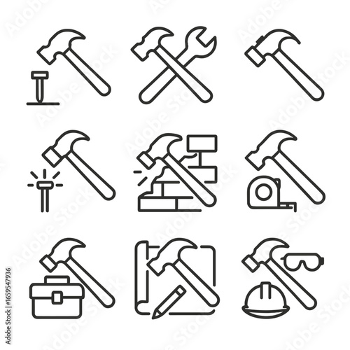 Hammer Icon Set. Outline icon set of hammer symbols: hammer and nail, hammer and wrench, crossed hammer, hammer with sparks,