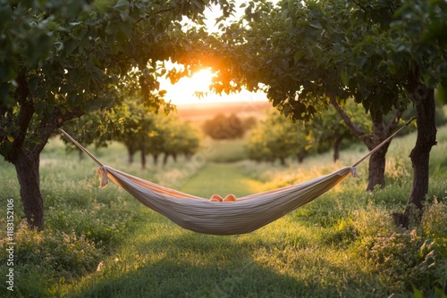 Hammock between trees in a sunny orchard during golden hour