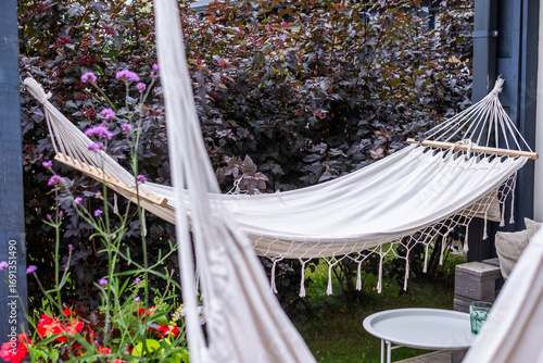 Hammock nestled in lush greenery, surrounded by vibrant flowers, inviting relaxation and tranquility in a peaceful countryside setting with airy atmosphere and carefree vibes