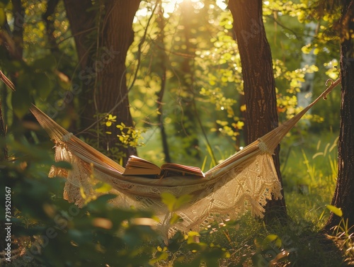 Hammock relaxation, book in hand, nestled between trees, summer breeze