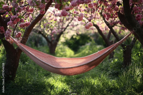 Hammock under a blooming cherry blossom tree in spring