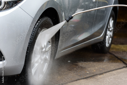Hand Car Wash centre cleaning car wheel under high pressure water outdoors