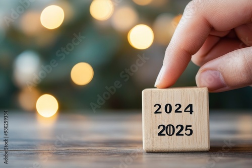 Hand Changing Date On Wooden Cube Calendar From "2024 To 2025" - New Years Concept with generative ai
