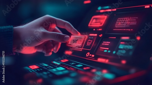 Hand Clicking Shopping Cart Icon on Red Neon Screen