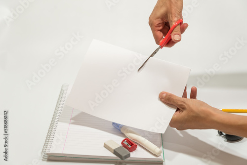 hand cutting with scissors a sheet of paper, eraser and liquid paper on the table