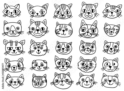 Hand drawn big set with doodle cat faces isolated on white background. Line funny collection.