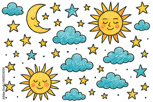 Hand drawn colorful celestial pattern with stars moon sun clouds. Whimsical sky doodle seamless background. Cute cartoon space elements vector illustration