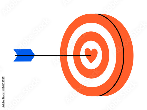 Hand drawn cute cartoon illustration arrow hit center of target with heart. Flat vector mutual feelings in doodle style. Find perfect match icon. Dating online app print. Romantic love. Isolated.