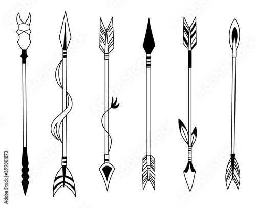 Hand drawn feather arrow, tribal feathers on pointer and decorative boho bow, feather indian arrowhead. Native aztec or hipster tattoo sketch isolated symbols set.