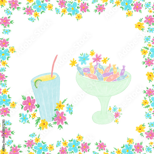 Hand drawn flowers frame with lemonade and sweets, drawn in soft colors, good for greeting cards, prints, planners, notes, copybooks