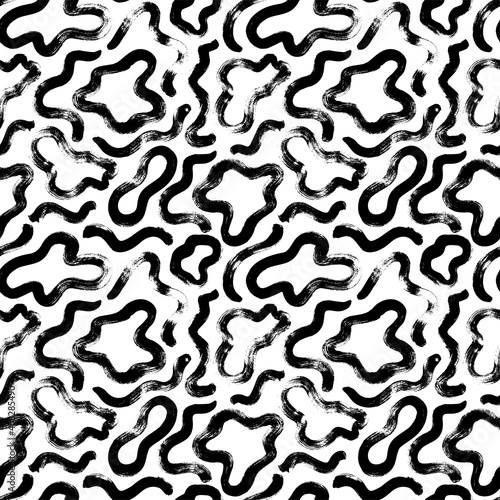 Hand drawn fluid shapes seamless pattern. Black vector ink illustration. Wave grunge lines, liquid shapes in Memphis style. Organic and bio ornament, hand painted abstract texture, dry brushstrokes.